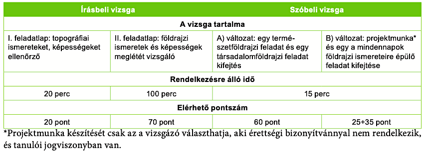 Az írásbeli vizsga összpontszáma 10 ponttal csökkent (mindegyik összetevő 5-5 ponttal), a szóbeli vizsgáé pedig 60 pontra nőtt. Ezzel kissé csökkent az objektívebb írásbeli vizsgarész aránya az összeteljesítményben. A B változat esetén a projektmunka 25, a tétel kifejtése 35 pontot ér. A projektmunka elbírálását részletes értékelési útmutató segíti. A 2021-ben elfogadott változásokhoz kapcsolódóan vált a vizsgaleírás hivatalos részévé a topográfiai követelmény, amely már közép- és emelt szinten is megjelent. Ugyancsak a vizsgaleírás része lett a földrajzi fogalomtár is.