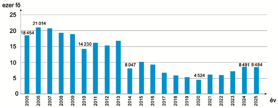 A középszinten vizsgázók számának alakulása 2005–2025 között (adatok forrása: Oktatási Hivatal)