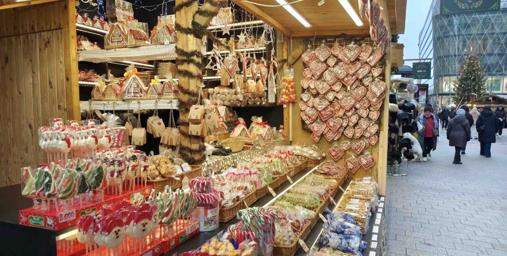 A budapesti Vörösmarty téri adventi vásárban már alig látni hagyományos magyar édességeket (szaloncukrot sem!), de a mézeskalácsfigurák még fellelhetők. (fotó: Makádi M.)