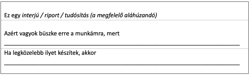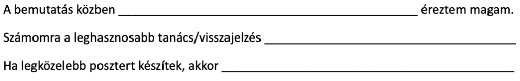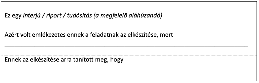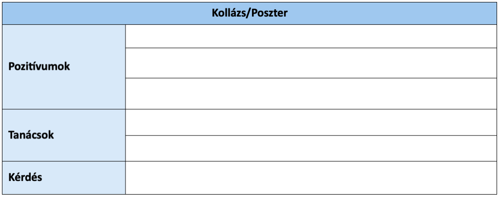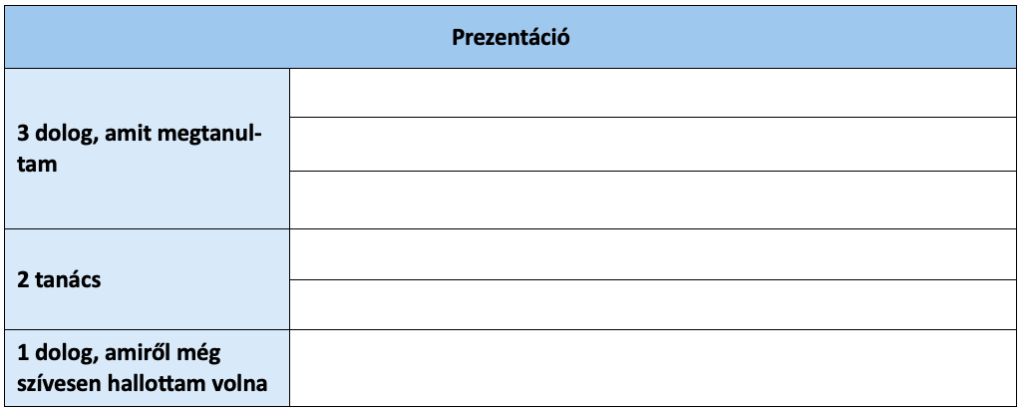 Példaként két különböző szempontrendszerrel megalkotott 3-2-1 táblázatot készítettem el. Az egyik általánosabb szempontokat követ, míg a másik inkább tartalmi elemek értékelésére fókuszál. Mindkettő nyitott válaszlehetőséget kínál, az értékelőnek kell megfogalmaznia a véleményét a három kategóriának megfelelően.