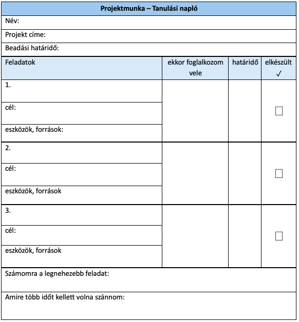 Az általam elkészített tanulási napló egy projektmunka megtervezésében és végigkövetésében segít a tanulóknak. Azért érdemes egy projektfeladat keretében tanulási naplót is vezettetni a tanulókkal, mert így nemcsak a végső produktumot tudjuk megismerni, hanem a mögötte folyó munkát is. Ez lehetőséget ad arra, hogy a tervezéssel kapcsolatosan is tudjunk fejlesztő jellegű visszajelzést nyújtani, ami nagyban elősegítheti, hogy a tanulók a jövőben még eredményesebb munkát tudjanak végezni.