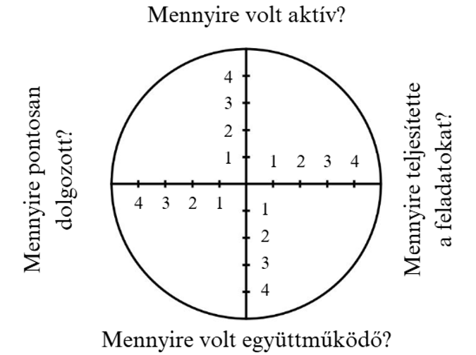Jelöld a skálán, hogy milyennek értékeled a társad munkáját a megadott szempontokból! (1 – legrosszabb, 4 – legjobb) Miután bejelölted, kösd össze az egymás melletti értékeket, hogy kirajzolódjon a pókháló!