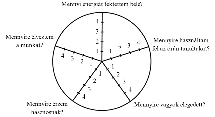 Amennyiben a tanulók még nem végeztek korábban semmilyen önreflexiós gyakorlatot, nem elvárható, hogy azonnal önállóan, mindenféle segítség nélkül megtegyék ezt, ezért például egy ilyen diagram alkalmas lehet arra, hogy megindítsa a tanulók gondolatait anélkül, hogy túl sok elvárást állítana velük szembe. A diagram formájából adódóan a tanulók nem azzal találják magukat szemben, hogy hosszabb, összefüggő szöveget kell írniuk a saját teljesítményükről, ami sokaknak elrettentő lehet, hanem a gondolataikat röviden tudják megfogalmazni. Emellett a tanulók támpontok alapján reflektálhatnak a teljesítményükre, nem önállóan kell a reflexió struktúráját kitalálniuk. A diagram „érdekel még” részében megfogalmazott gondolatok pedig arra adnak lehetőséget, hogy a tanulók további célokat tűzzenek ki maguknak, ezzel is motiválhatók a témában való mélyebb elmerülésre.