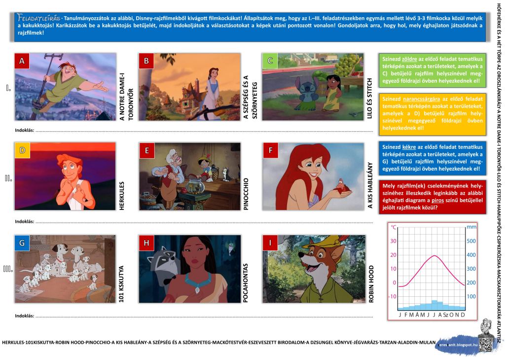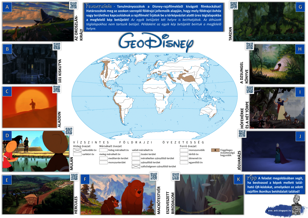 A rajzfilmek is játszódnak valahol: ezek lehetnek konkrét vagy fiktív helyszínek. A Notre Dame-i toronyőr például Párizsban játszódik, ám a Jégvarázs esetében nincs konkrét helyszín megnevezve, csupán annyit tudunk, hogy norvég tájak jelentették az inspirációt. Ebből az alaphelyzetből született meg ez, a GeoDisney címre hallgató feladat is, amelynek középpontjában néhány jelentősebb Disneymese-helyszín és az azokhoz kapcsolódó földrajzi öv vagy terület áll. A bemutatásra kerülő két feladat lényege, hogy a párokban dolgozó tanulók a rajzfilmekből kivágott képkockák, betétdalok és saját emlékeik segítségével azonosítsák, hogy az egyes kultikus mesefilmek hol, mely földrajzi övben vagy területen játszódhatnak. A feladat megoldása közben szinte valamennyi öv és terület említésre kerül, így az alkalmas lehet akár az övezetesség témájának összefoglalásához is.