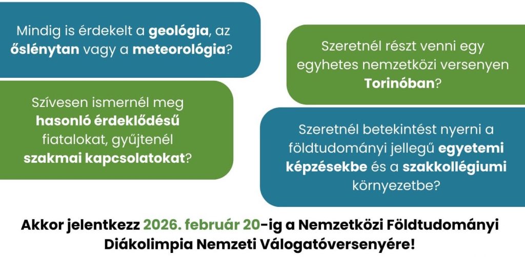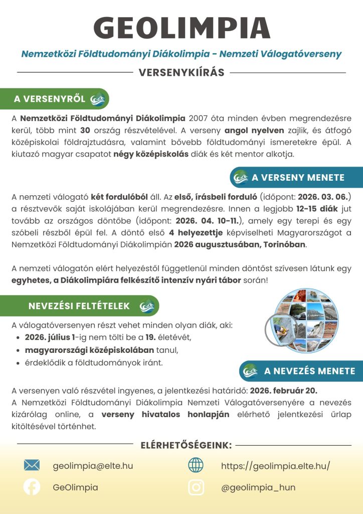 A Nemzetközi Földtudományi Diákolimpia a világ legrangosabb földtudományi tanulmányi versenye, amelyen évente több mint harminc ország vesz részt. A nemzeti válogató célja annak a négy középiskolás diáknak a kiválasztása, akik 2026 augusztusában, Torinóban képviselhetik Magyarországot a nemzetközi döntőn. A verseny a természetföldrajz, a geológia, a meteorológia és a környezettudomány területeit öleli fel, és gondolkodtató feladatokon keresztül kínál magas szintű szakmai kihívást.
