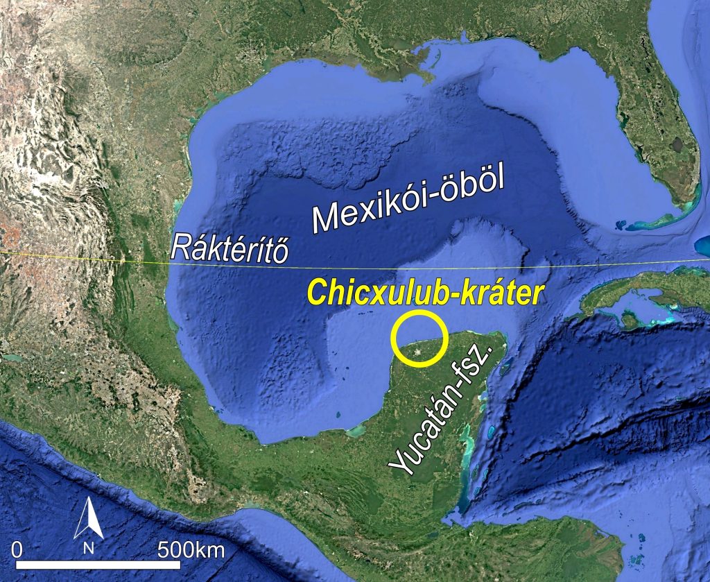 A Chicxulub-kráter a Yucatán-félszigeten (szerk. Telbisz T.). Igen nagy valószínűséggel az itt történt meteorbecsapódás okozta a dinoszauruszok vesztét.