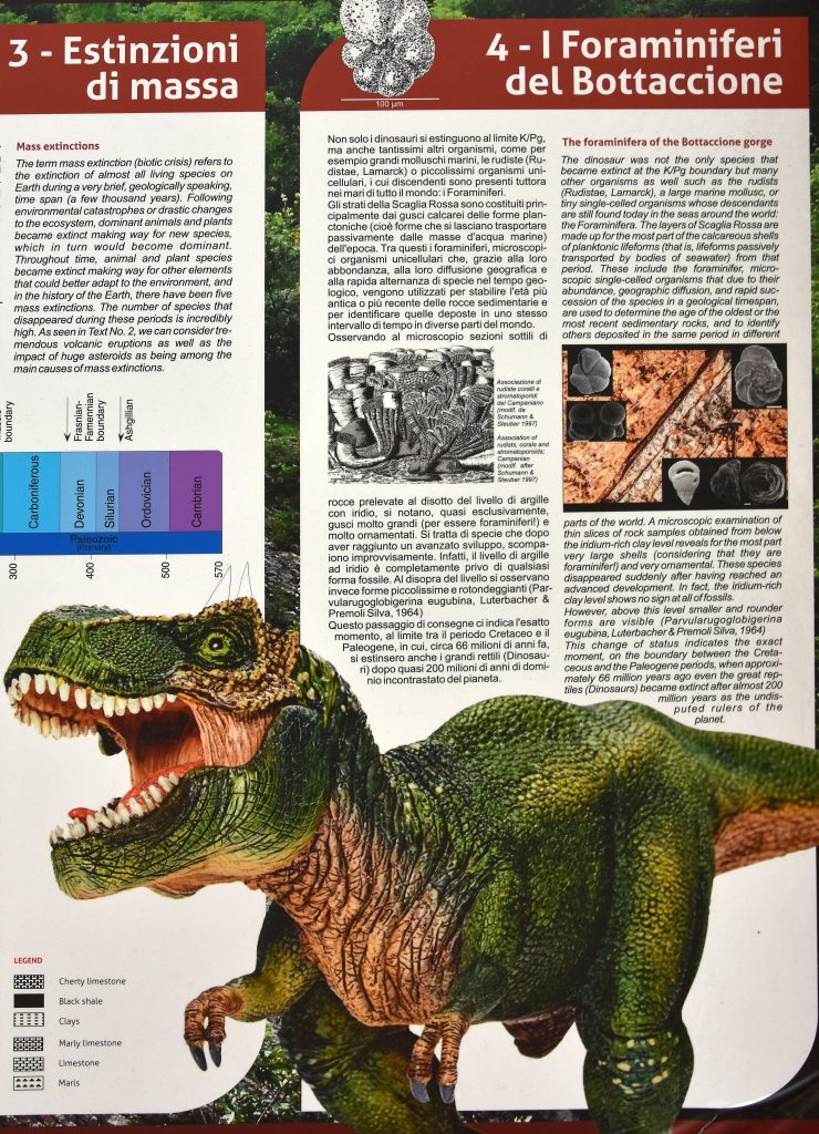 Ha elindulunk ezen az ösvényen, akkor egy hihetetlen nagy jelentőségű felfedezés terepi dokumentumához érkezünk mintegy 1,5 km-re a városkától. A szurdok falát nagyrészt ferde, enyhén gyűrt mészkőrétegek alkotják. Látványnak sem utolsó, de tudományos jelentősége még sokkal nagyobb. Az itt látható rétegek 140 millió évtől 30 millió évvel ezelőttig rakódtak le az egykori Tethys-óceán fenekén. Rendkívül hosszú, folyamatos üledékképződés volt itt – egy olyan történelemkönyv, amiből egyetlen oldal sem hiányzik ezen időszakon belül! Később kibillent és meggyűrődött a terület, de az már az Appenninek – kontinensünk legfiatalabb magashegysége – születésének és kialakulásának időszaka. Ám a korábbi, hosszú tengeri időszakot itt nem bolygatták meg szerkezeti mozgások, és éppen ez a zavartalanság a fő érték. Emiatt ez a feltárás már több mint 100 éve egy „izgalmas hely” a geológusoknak (Menichetti, M. et al. 2016). De nem a dinoszauruszok miatt, hiszen azok leletei nem találhatók meg ebben a mélytengeri rétegsorban, bár a kihalási esemény és az ahhoz tartozó nagyon vékony agyagos réteg itt is felismerhető. A földtan tudósai itt dolgozták ki a Föld mágneses terének időről-időre való megfordulásán alapuló paleomágneses skálát is a fent megadott időszakra, az 1970-es évek végén pedig az üledékképződés sebességét próbálták meghatározni e rétegek alapján. Addigra már ismert volt az a fizikai tény, hogy az irídium nevű kémiai elem a földkéregben „magától” nem fordul elő, csak az űrből érkezhet. Az évente a Földre hulló több ezer tonna meteoritporból egész kis mennyiségben rakódik le és halmozódik fel az irídium az üledékes rétegekben. Ennek a mennyiségét kezdte el mérni a geológus Walter Alverez, a Nobel-díjas fizikus Luis Alvarez fia, aminek eredményeként óriási meglepetésre az derült ki, hogy hajszálpontosan a kréta-harmadidőszaki (tercier) határon (a továbbiakban röviden: K-T határon; 9. ábra) az irídium koncentrációja több nagyságrenddel megugrik. (Megjegyzendő, hogy újabban a geológiai szakirodalomban kerülik a harmadidőszak, illetve az azzal egyenértékű tercier elnevezést, hanem helyette csak a tercier első, illetve második részét jelentő paleogén és neogén megnevezéseket használják. Így K-T határ helyett manapság K-Pg határ néven emlegetik ezt a fontos határvonalat.)