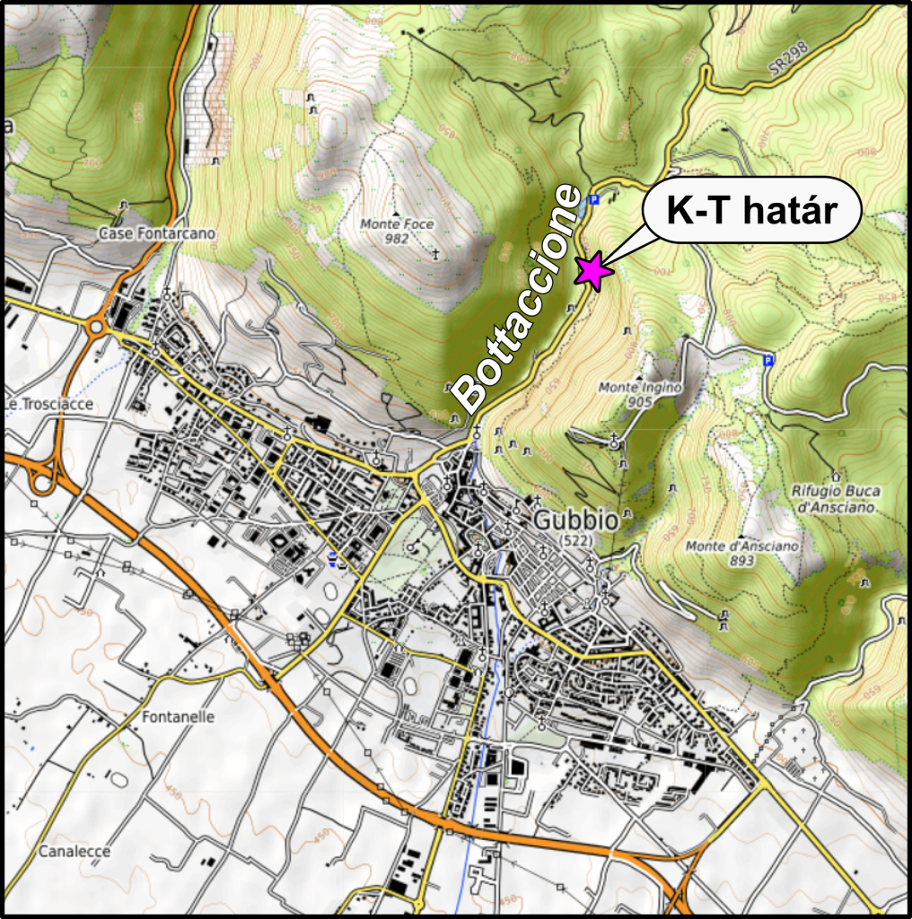 A kréta-tercier (K-T) határ feltárásának helye a Bottaccione-szurdokban (forrás: opentopomap.org)