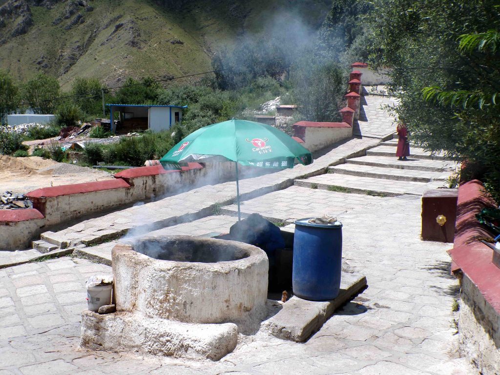 A kolostorok elmaradhatatlan látványa a fehéres füst gomolygása az épületek udvarain. Tibetben borókát égetnek nagyobb edényekben. Sok hívő viszont füstölőpálcát szúr bele a tartó homokjába. A füstölők illata kellemes, nyugtató hatású, a megtisztulás jelképe, a jó szellemeket vonzza, de a gonoszakat elriasztja, a kívánságokat a felszálló füst az égig viszi. Volt idő, amikor a szertartási állatáldozatok szagának elnyomására is szolgált. A tibeti füstölők akár 25-30 fajta gyógynövényből is állhatnak, főként tikfa, szantálfa, sáfrány, mirha, pézsma illatúak, vagy egyéb fűszernövényekből készülhetnek.