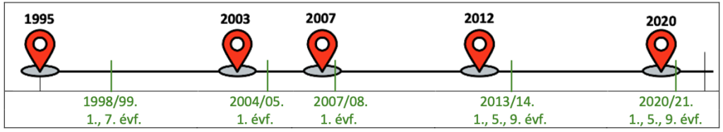 A Nemzeti alaptantervek idővonala a megjelenési év, valamint a bevezetési év és évfolyam megjelölésével (szerk. Makádi M.)