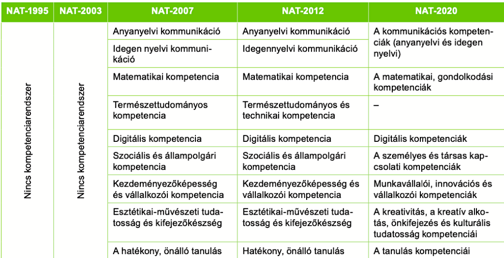kulcskompetenciák – a megszerzett tudásra épülő, az egyes tanulási területeken átívelő, valamint nem kizárólag egyetlen tanulási területhez köthető képességek, attitűdök – a 2007-es alaptantervben kerültek részletes kidolgozásra és egységes rendszerbe a dokumentum egészében, amit a 2012-es tantervi átdolgozás lényegében nem is érintett (Makádi M. 1999, 2020, 2022). Ám a 2020-as alaptantervben a földrajz szempontjából lényegesen csorbult a rendszer, hiszen a természettudományos kompetencia kikerült a kulcskompetenciák közül. (Erre hívja fel a figyelmet a Magyar Földrajzi Társaság 2020-as állásfoglalása is [link2]. Megjegyzendő, hogy a NAT a kulcskompetenciák felsorolásakor az Európai Tanács ajánlására [link6]hivatkozik, azonban abban szerepel a természettudományos kompetencia.) Ez ismét egy lépés a természettudományi tudás „lefokozásában”, amit a földrajz – bár csak részben természettudományi tantárgy – azokkal együtt szenved el évtizedek óta.