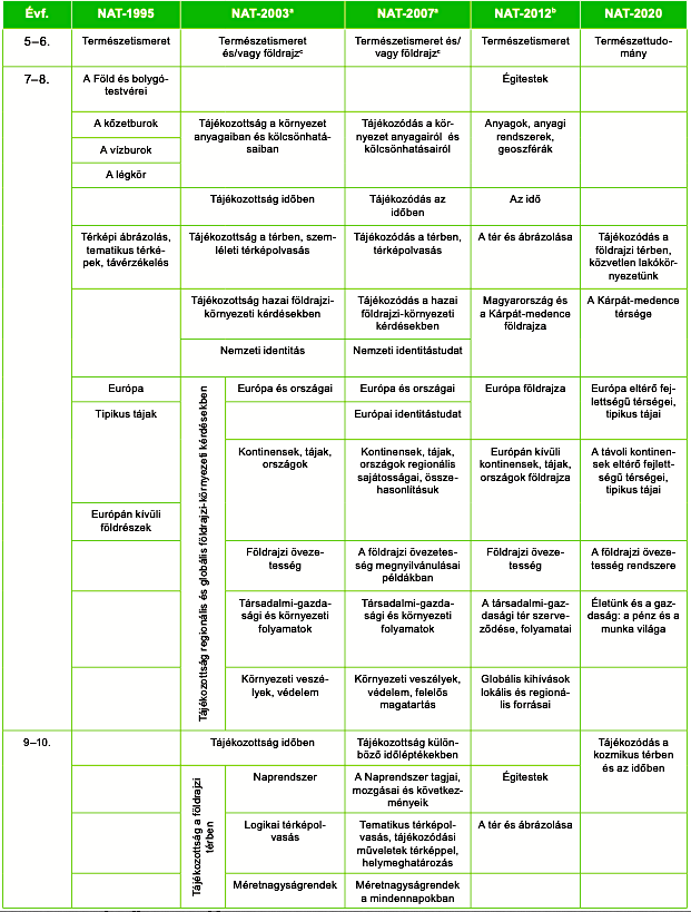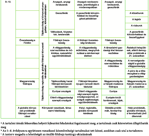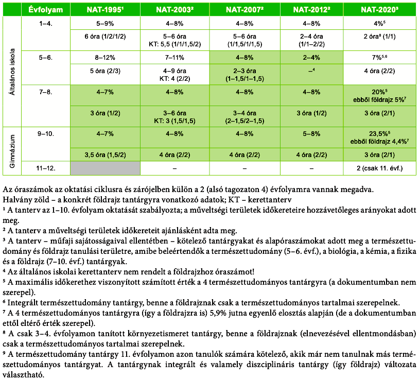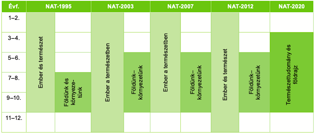 A földrajz szerepe mindig is különleges volt a tantárgyak között, mert egyedülálló módon hidat képez a természettudományokat és a társadalomtudományokat közvetítő ismeretkörök között. Híd szerepéből következik a többi természettudományos tárgy (fizika, kémia és biológia) tudásrendszerét (is) szintetizáló jellege, a földi jelenségek bemutatásakor támaszkodik az általuk feltárt tényekre, törvényszerűségekre, összefüggésekre (Probáld F. 1999, Makádi M. 1999, 2020). Ebből a szempontból különösen fontos a földrajzi vonatkozású műveltségi területek – alapvetően a Földünk – környezetünk, illetve az Ember és természet (elnevezéseik némileg változtak az évtizedek során) – időbeli elhelyezése. A földrajz szintetizáló szerepe alig tud megvalósulni a köznevelési rendszerben (Makádi M. – Horváth G. 2011). Mint ahogyan az az alábbi táblázatban is jól érzékelhető, úgy kellene szintetizálnia, hogy a földrajzi tartalom feldolgozása előbb (a 10. évfolyam végén) zárul, mint azon tantárgyaké, amelyeknek az ismeretanyagát és az azok feldolgozása során elsajátított képességeket, kompetenciákat fel kellene használnia. A szintetizáló szerep az utóbbi években azáltal is sérül, hogy a földrajzot az alapképzési szakaszban integrált szemlélettel alapozó műveltségi területbe tartozó környezetismeret tanulása 2 évet elveszített, az 1–2. évfolyamon megszűnt. A földrajz szempontjából további „ellehetetlenülést” jelent, hogy a 3–4. évfolyamon tanított környezetismeret tantárgy tartalma is már csak a természeti környezetre szorítkozik, így a földrajz társadalomtudományi tartalmai alapozás nélkül maradnak az alapképzés szakaszában.