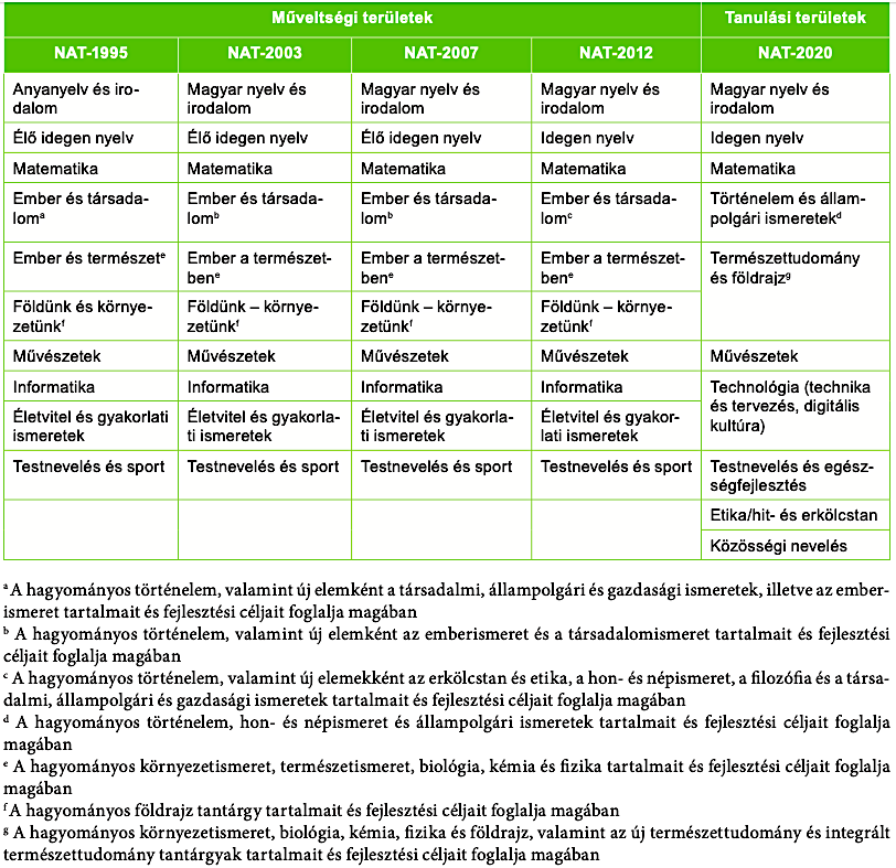 A 2020-as alaptantervben a műveltségi területek tanulási területekké való átkeresztelése látszólag stilisztikai változtatás, valójában azonban nem az. Az elnevezésváltozás az eredeti értelmezéssel való szakítást jelenti, tehát azt, hogy a kultúrából azokat a társadalmi, pedagógiai és logikai szempontok szerint kiválasztott és elrendezett művelődési javakat foglalja össze, amelyek alkalmasak arra, hogy rendszerükhöz igazodva belőlük tantárgyakat hozzanak létre (Makádi M. 1996, 2020, 2022). A továbbiakban tantárgycsoportokként kezeli azokat, ami a kötelező tantárgyi rendszer előírása felé vezet vissza. Ezt erősíti a műfajidegen tantárgyi rendszer és óraszámtáblázat megjelenése is a NAT-ban.