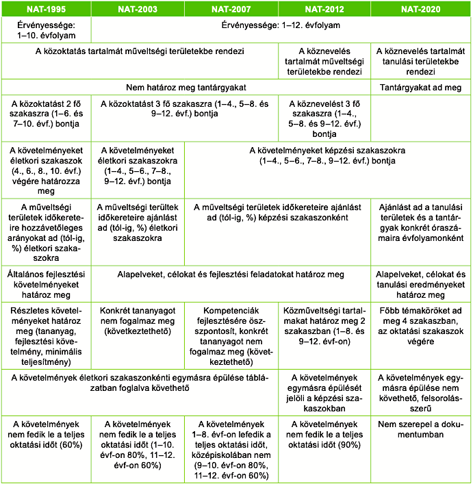 A Nemzeti alaptantervek jellemzőinek időbeli változását az alábbi táblázat foglalja össze.