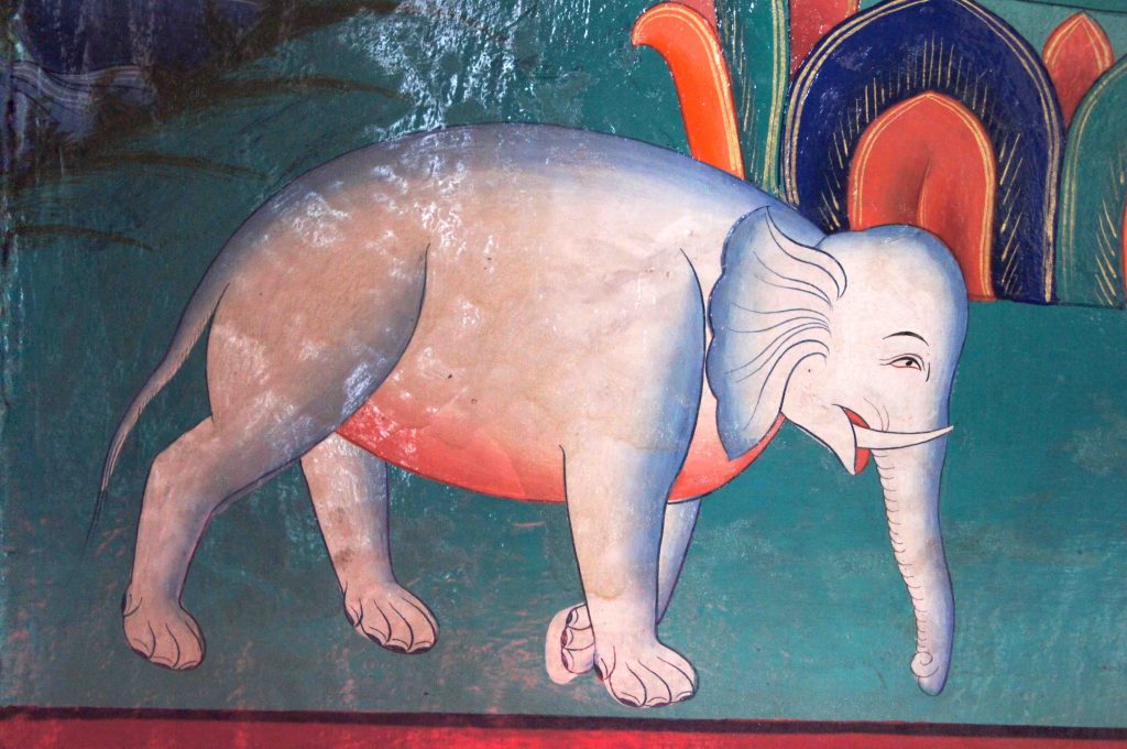 Sokszor találkozhatunk állati jelképekkel is, ilyen a fehér elefánt ábrázolása. Az állathoz sok kolostor alapításának legendája fűződik (pl. ahol a megvadult fehér elefánt megállt), a szellemi erő, nyugalom, bölcsesség szimbóluma is. Buddha születését is kapcsolatba hozzák vele, miszerint Buddha édesanyja fehér elefántról álmodott, mielőtt gyermeke megszületett, ami a szentességet, bölcsességet és egy jobb jövőt jelképez.